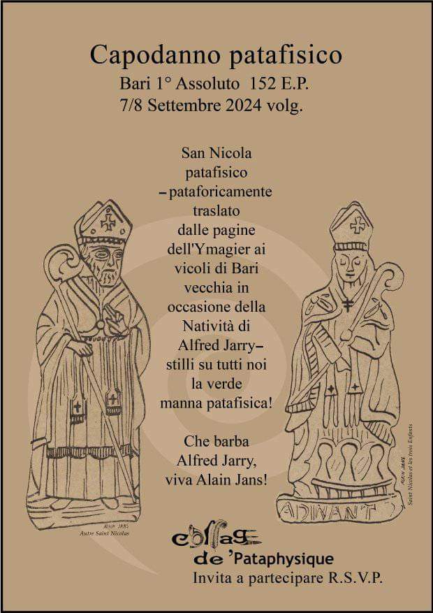 Il CollAge de ’Pataphysique è un progetto di cooperazione artistico-scientifica attorno alla ’Patafisica che porto avanti da più di 25 anni. CD’P si dedica alla Ricerca, lo Studio e la Diffusione della ’Patafisica e favorisce il pensiero patafisico con particolare attenzione a tutte le forme artistiche, letterarie e scientifiche in ambito nazionale e internazionale.