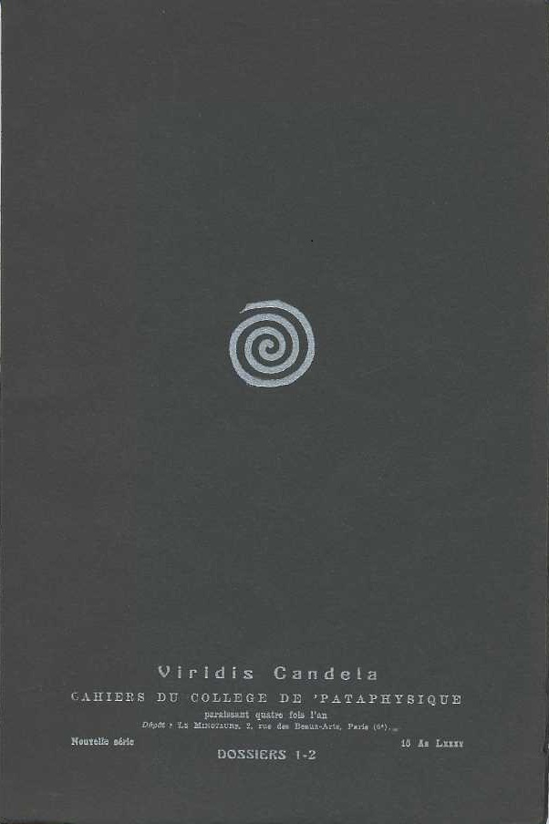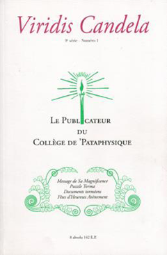 On this page you will find descriptions of the various issues of the College journal, written in French, the Viridis Candela. The main topic of each issue is summarised and a list is given of the articles that consider the subject under discussion; these are accompanied by news from the College and of external events that may be of interest to pataphysicians.